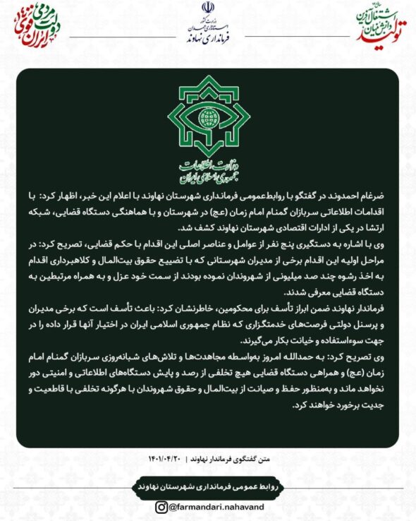 فرماندار نهاوند ضمن ابراز تأسف برای محکومین، خاطرنشان کرد: باعث تأسف است که برخی مدیران و پرسنل دولتی فرصتهای خدمتگزاری که نظام جمهوری اسلامی ایران در اختیار آنها قرار داده را در جهت سوءاستفاده و خیانت بکار میگیرند.