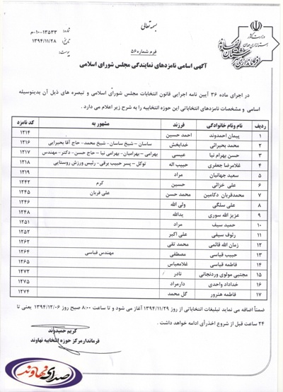 اسامی ۱۷ کاندیدای شهرستان نهاوند به شرح ذیل است: