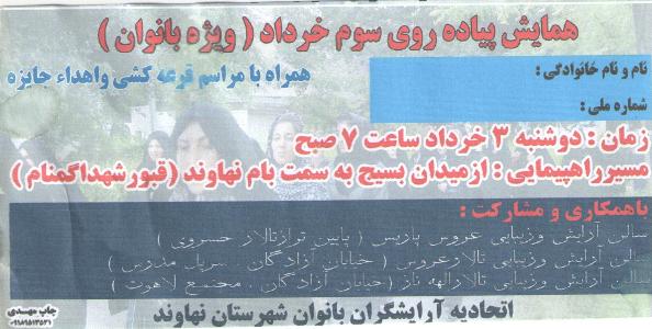 رئیس اتحادیه آرایشگران بانوان شهرستان نهاوند گفت: به مناسبت سوم خرداد سالروز آزادسازی خرمشهر، همایش بزرگ پیاده روی(ویژه بانوان) در نهاوند برگزار می شود.