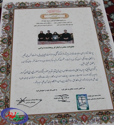 امام جمعه، فرماندار، شهردار، رئیس شبکه بهداشت و درمان و رئیس و اعضا شورای اسلامی شهر نهاوند در پایان این دیدار با اهدای لوح یادبود به پدر و مادر این مرحومه ، از این عمل خداپسندانه خانواده ترابی تجلیل کردند.